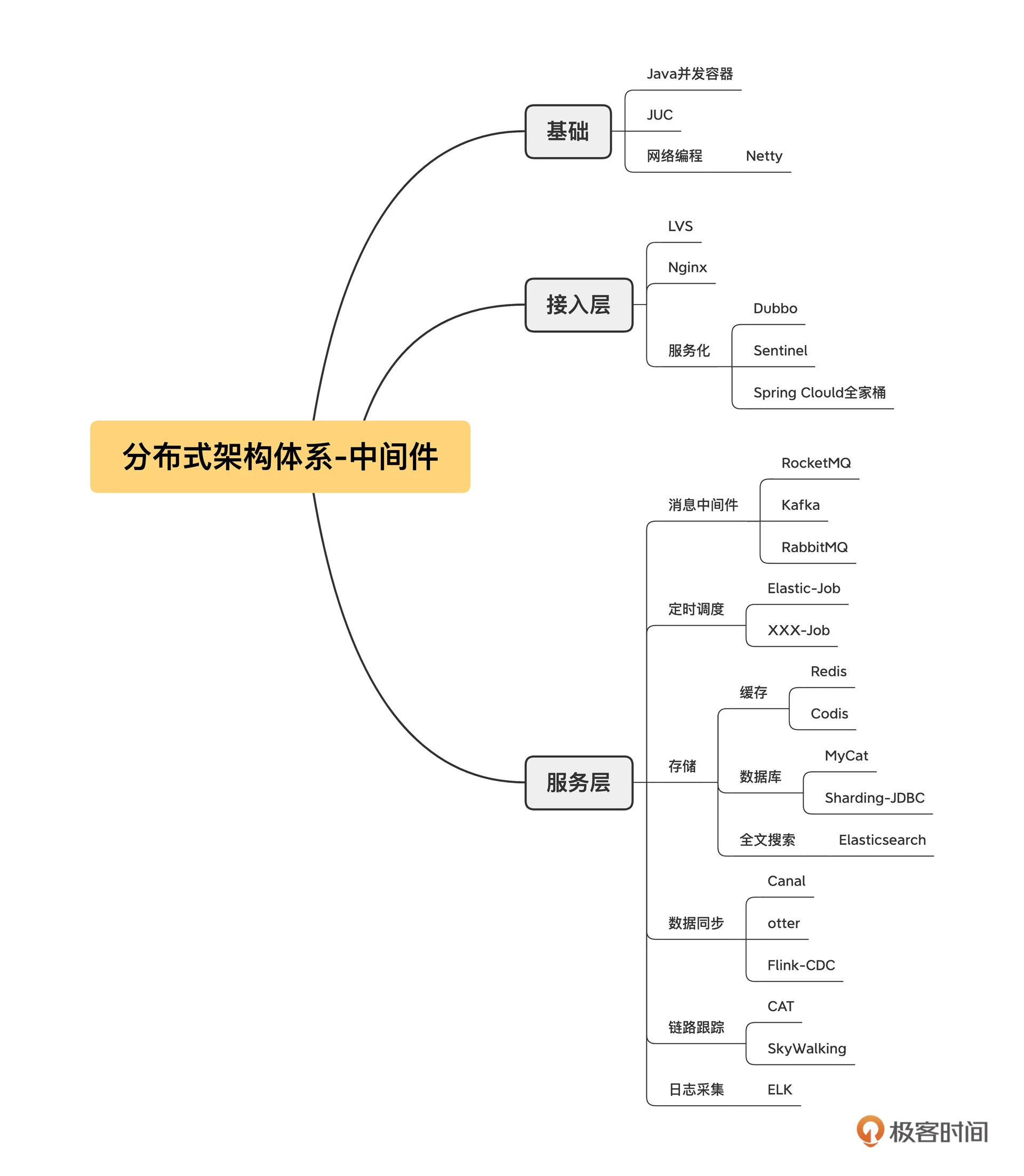 所以,在专栏的第三章到第五章,我会深度剖析微服务、消息中间件和定时调度这三个方向,结合生产级经典案例深入剖析它们的架构设计理念,带你扎实地掌握分布式架构设计相关的基本技能。