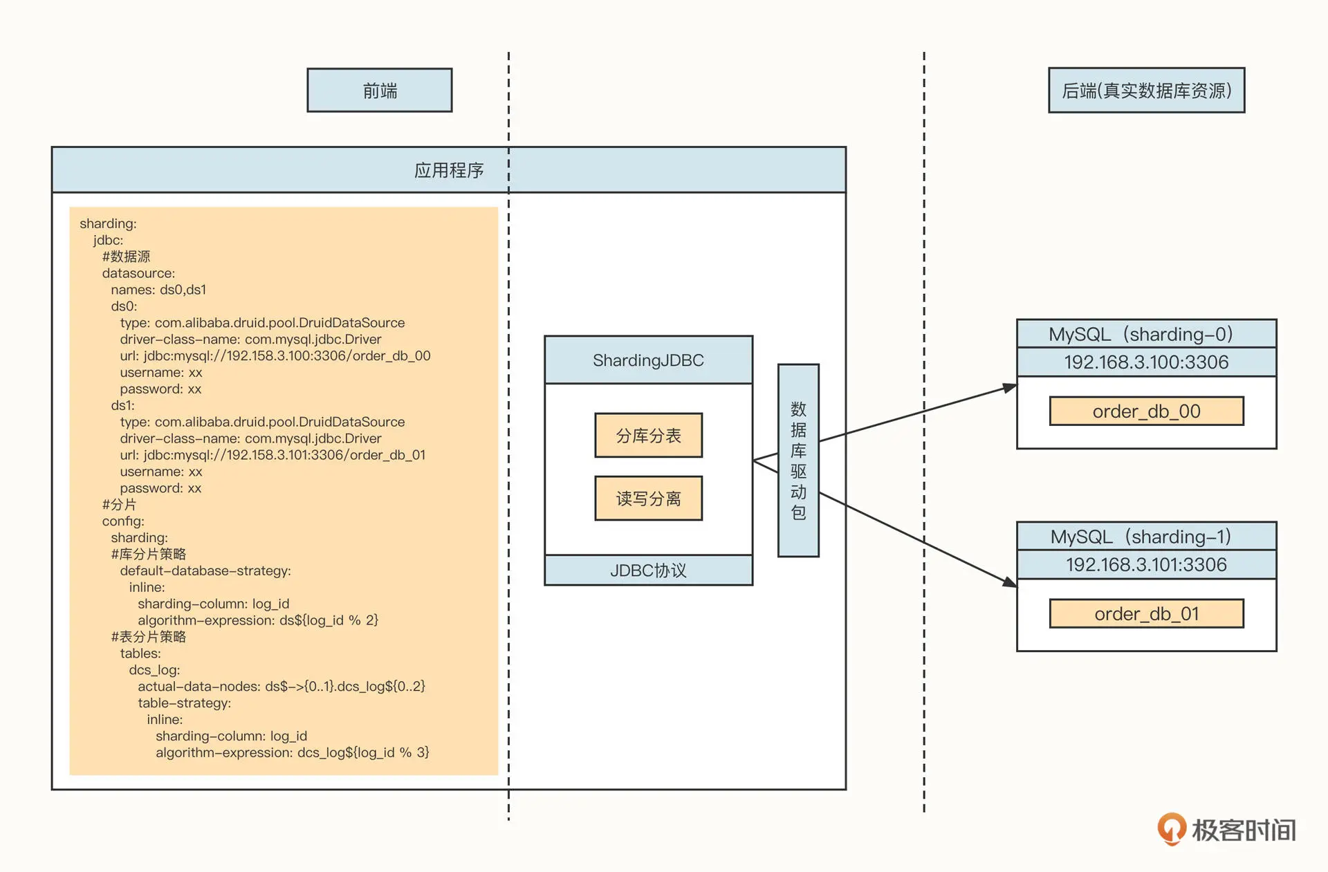 ShardingJDBC 主要实现的是 JDBC 协议。实现 JDBC 协议,其实主要是面向 java.sql.Datasource、Connection、ResultSet 等对象编程。它通常以客户端 Jar 包的方式嵌入到业务系统中,ShardingjJDBC 根据分库分表的配置信息,初始化一个 ShardingJdbcDatasource 对象,随后解析 SQL 语句来提取分库、分表字段值,再根据配置的路由规则选择正确的后端真实数据库,最后,ShardingJDBC 用各种类型数据库的驱动包将 SQL 发送到真实的物理数据库上。