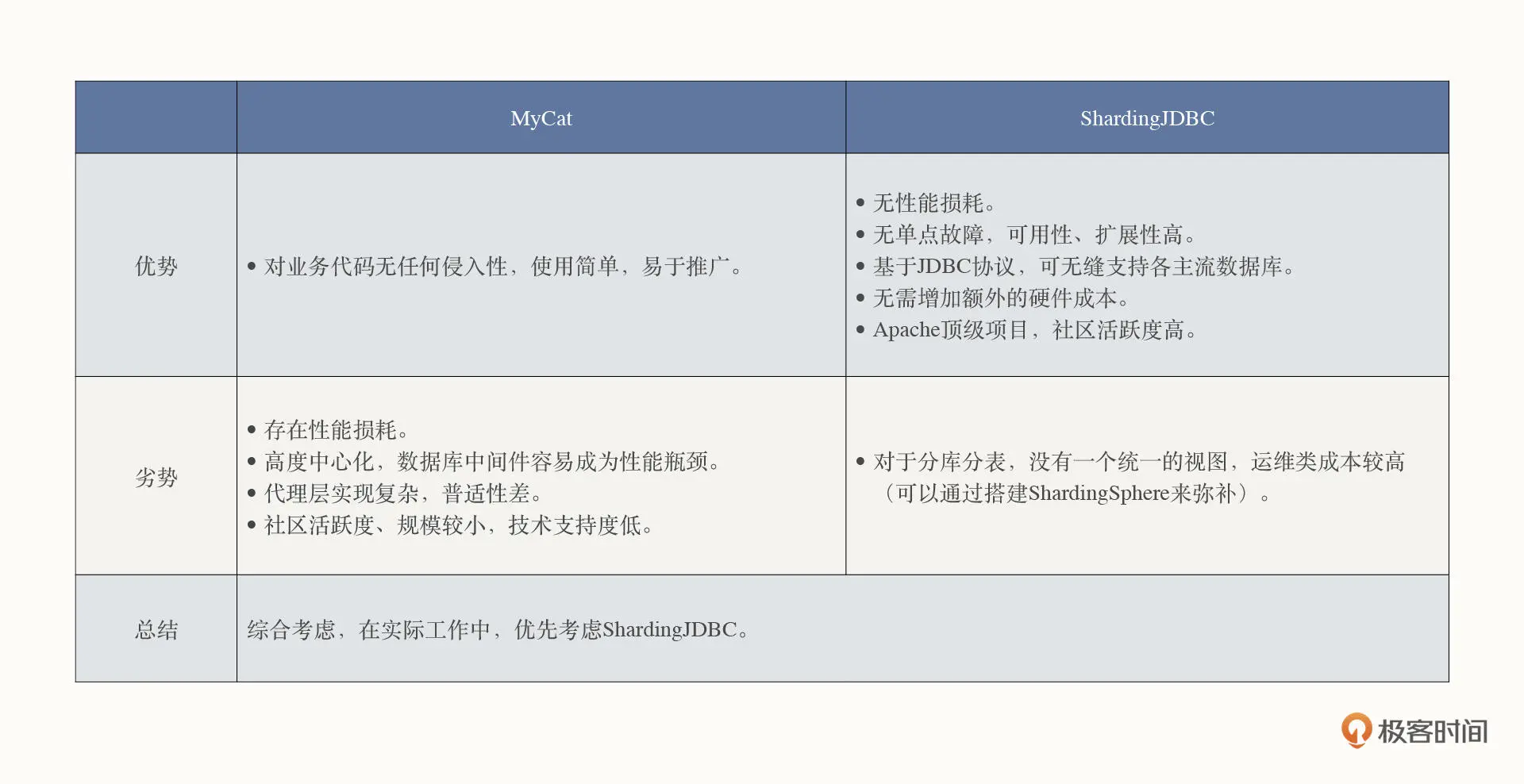 在没有 ShardingSphere 之前,使用 MyCat 也有一定优势。MyCat 对业务代码无侵入性,接入成本也比较低。但 ShardingSphere 弥补了 ShardingJDBC 对运维的不友好,而且它的性能损耗低、扩展性强、支持各类主流数据库,可以说相比 MyCat 已经占有明显的优势了。