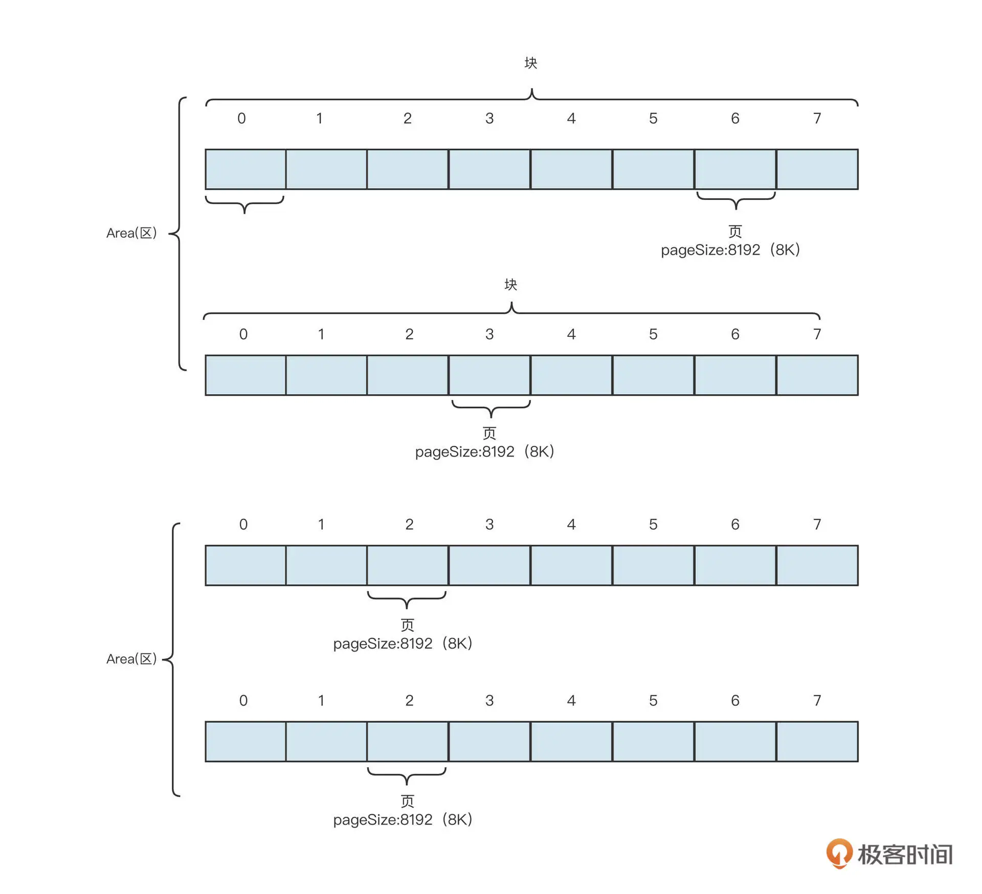 举个例子,数据库中间件的出现就是为了解决分库分表、读写分离等与数据库相关的问题。那如果要开发一款数据库中间件,你就必须对数据库有一个较为深入且体系化的理解。想要开发出一款 MyCat 这样基于代理模式的数据库,就必须了解 MySQL 的通信协议。我们甚至可以将相关领域的知识类比为我们要开发的业务系统的功能需求,这个是非常重要的。不过这部分我没有办法展开细讲,需要你自己去慢慢积累。我们还是说回内存管理。