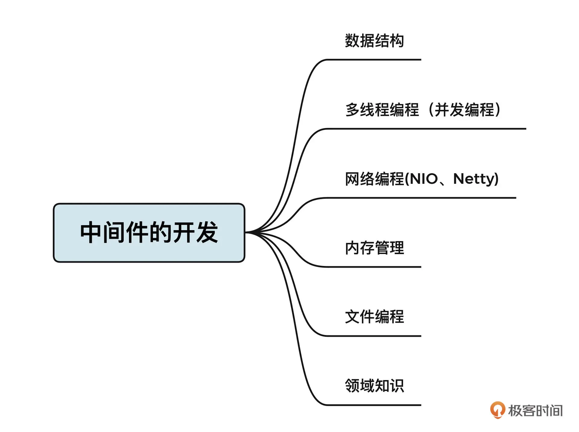 其中,数据结构、多线程编程和网络编程是中间件的必备基础,在前面的课程中,我也做了详细介绍。这节课,我会重点介绍内存管理和文件编程相关的知识,带你了解开发中间件的核心要点。