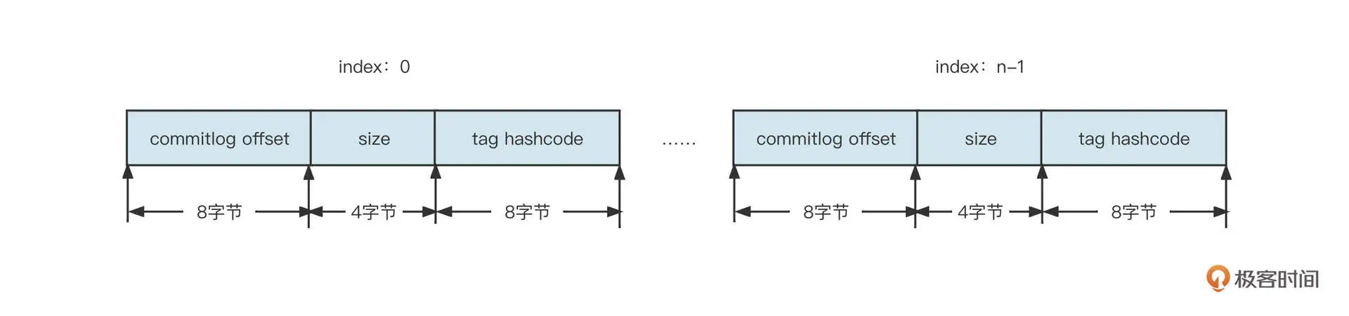 RocketMQ 具体的做法是,为每一个主题、队列创建不同的文件夹,例如 /topic/queue。然后,在该文件夹下再创建多个索引文件,每一个索引文件中存储数据的格式为:8 字节的起始偏移量、4 字节的数据长度、8 字节的 tag 哈希值。如下图所示: