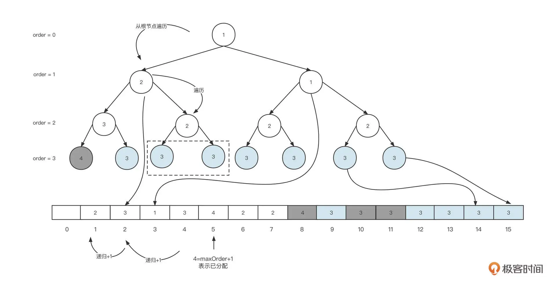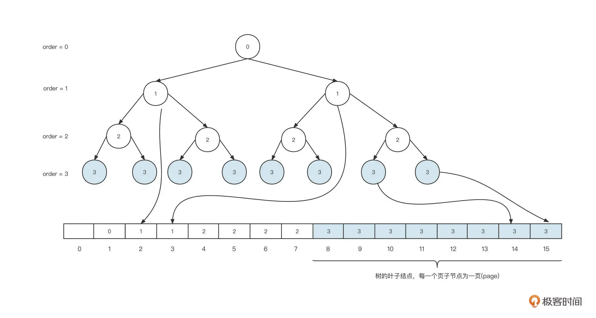 这种存储方式能够清晰地让我们看到这个节点能一次分配的最大内存。如果一个节点在数组中存储的值为 n,那么从该节点出发,能找到的叶子节点的个数为 2 的 (maxOrder-n) 的幂,而每一个叶子节点表示一页,所以能分配到的最大内存是 2 的 (maxOrder-n) 的幂 * 每页大小(pageSize)。