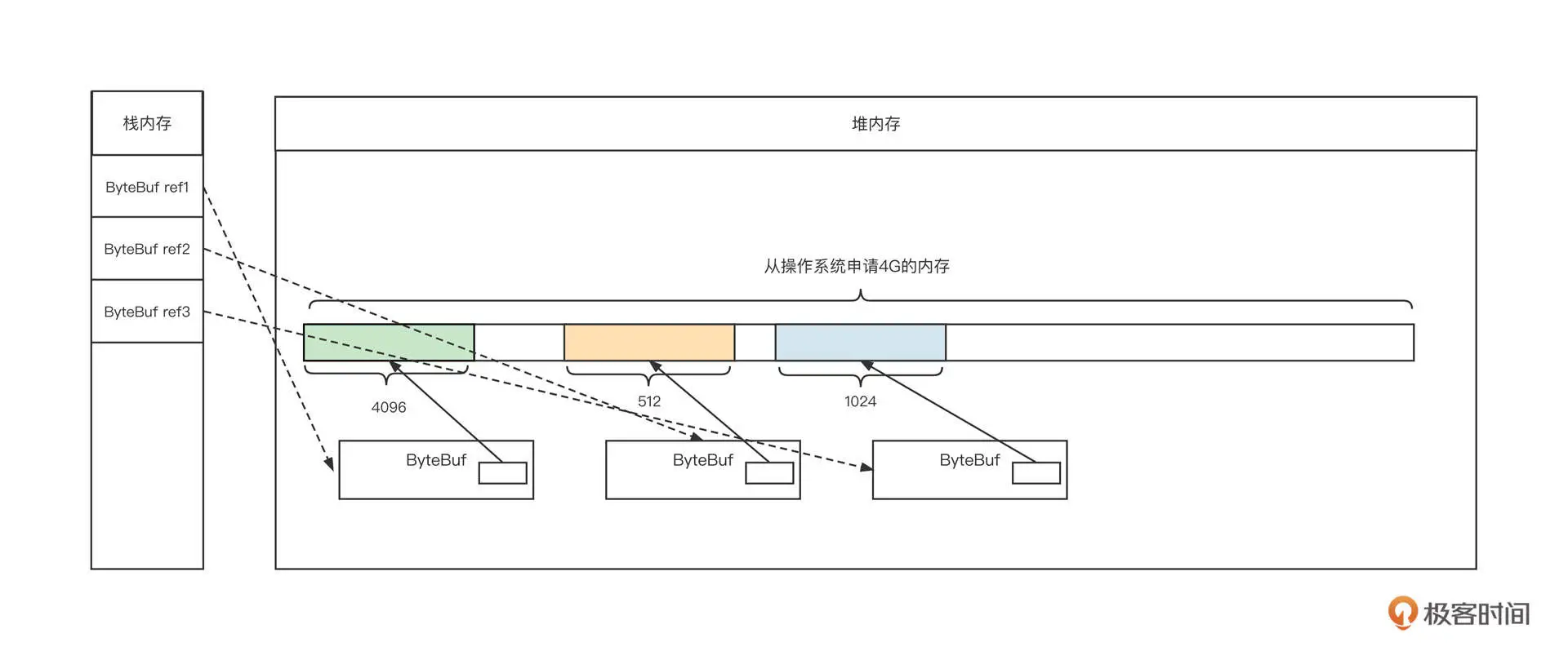 首先,Netty 会单独管理 ByteBuf 内部持有的内存,在启动进程时就向操作系统申请指定大小的内存。这样,这部分内存会被独占,并且在 JVM 存活期间一直可达。垃圾回收器不需要关注这部分内存的回收,由 Netty 负责管理内存的释放和分配。