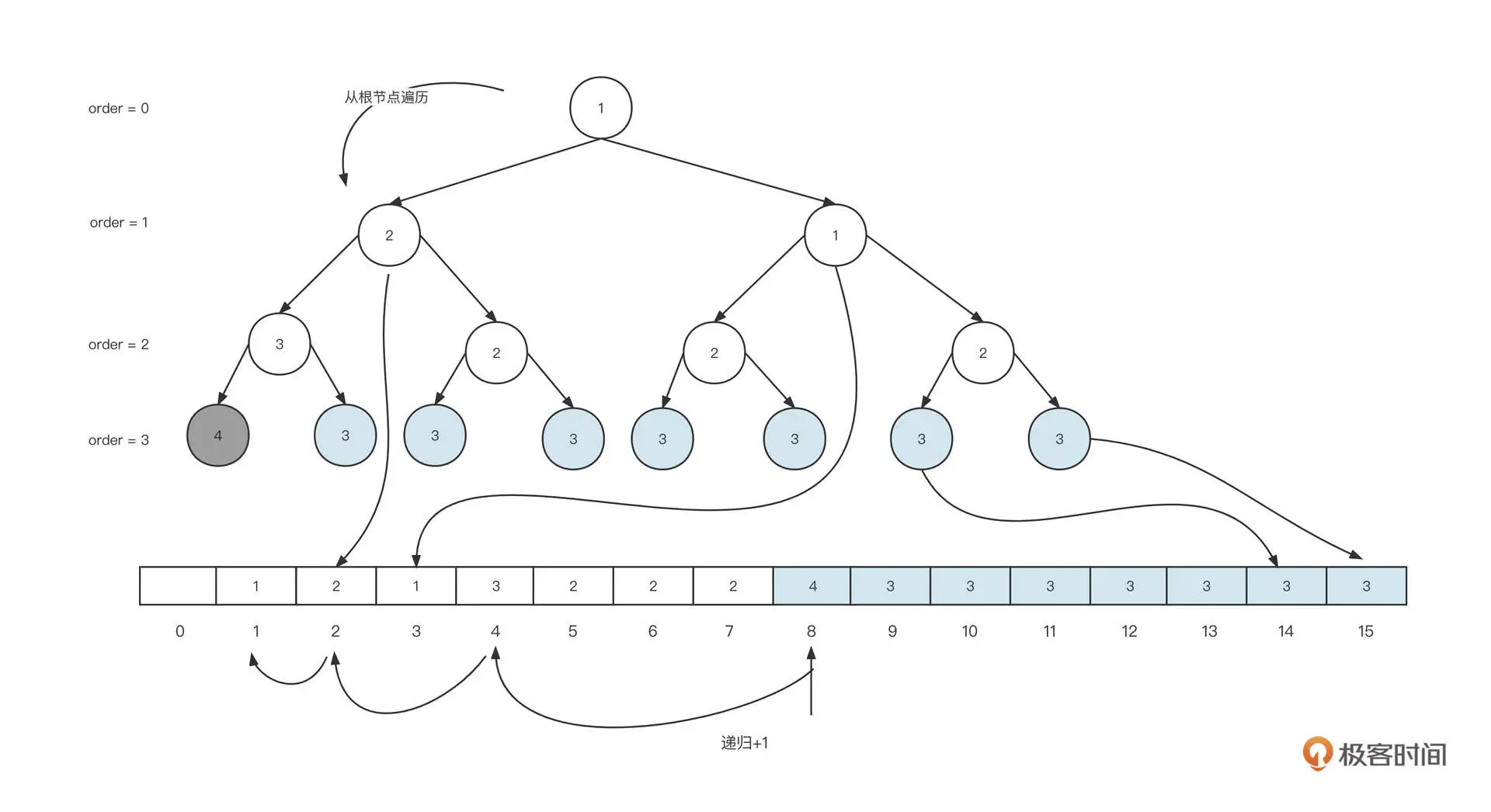 完全二叉树映射到数组中,每一个元素存储的内容为该节点在二叉树中的深度,也就是上图中的 order 信息。为了统一深度的定义,我们默认根节点的深度为 0(order=0)。也就是说,根节点存储在 array[1] = 0 中,根节点的两个子节点分别存在 array[2]和 array[3]中,并且它们的值都为 1,其他节点以此类推。