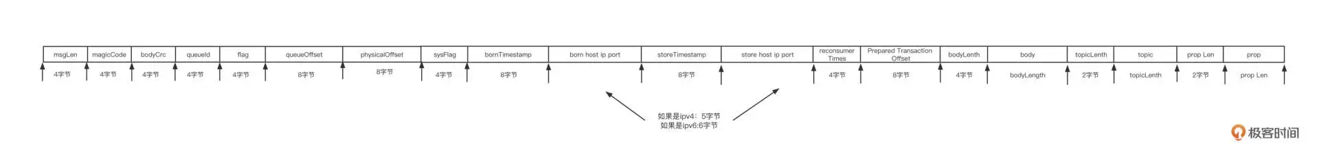 首先,我们需要为存储的内容设计存储协议。以消息中间件为例,RokcetMQ 中消息的存储格式如下图所示: