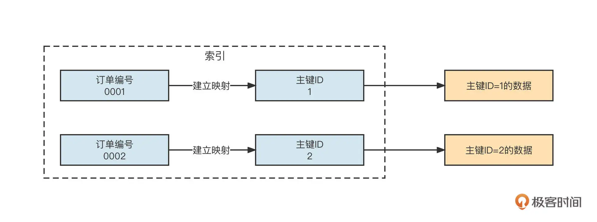 所谓的索引,就是将需要检索的内容 (订单编号) 与主键 ID 进行关联,在检索时,我们是先找到主键 ID,然后根据主键 ID 就能快速定位到内容,从而提升性能了。它的原理你可以参考一下下面这张图片。