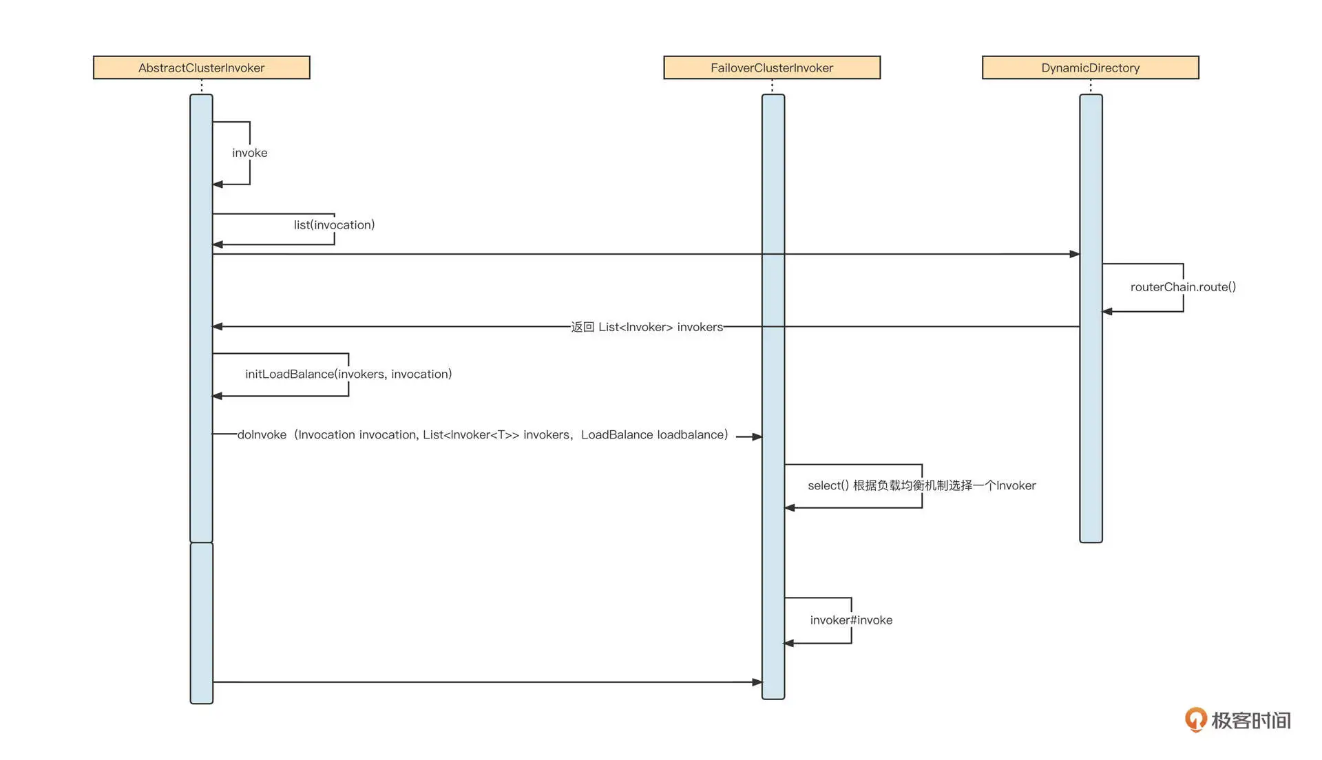 我建议你按照这张时序图跟踪一下源码,更加详细地了解 Dubbo 服务调用的核心流程与实现关键点,我在这里总结了几个要点: