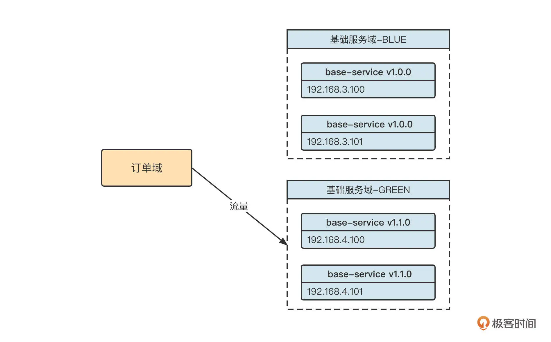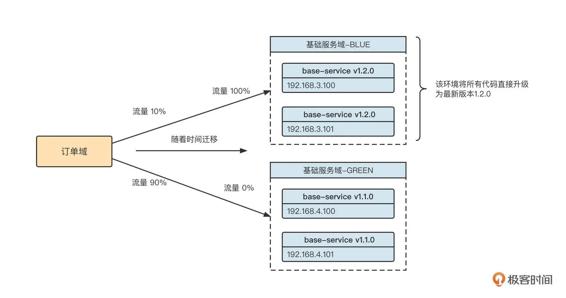 当前订单域调用流量进入基础服务域 GREEN 环境。团队计划在 12:00 发布新版本(base-service v1.2.0),这时我们通常会执行下面几个操作。