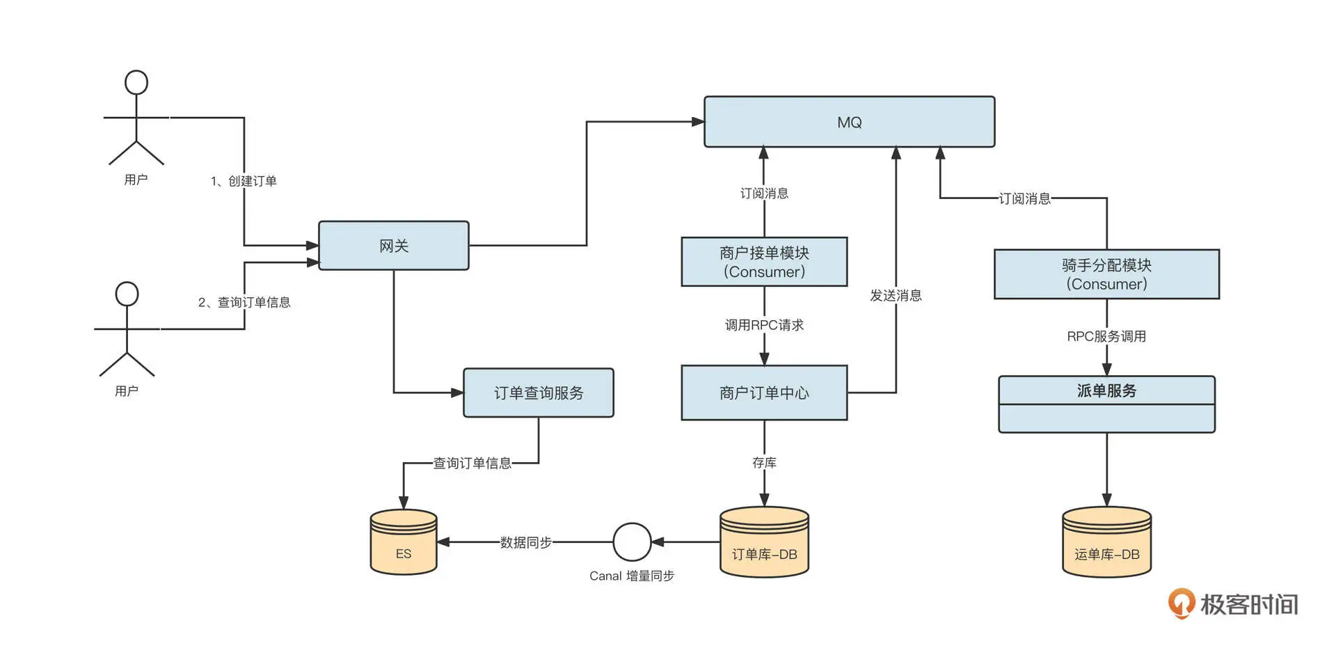 这里一个设计的亮点是,引入了数据同步组件 Canal,将 MySQL 数据库中的数据实时同步到了 Es。这样查询订单时只查 Es 就可以了,实现了订单写入与订单查询在异构数据源的读写分离。