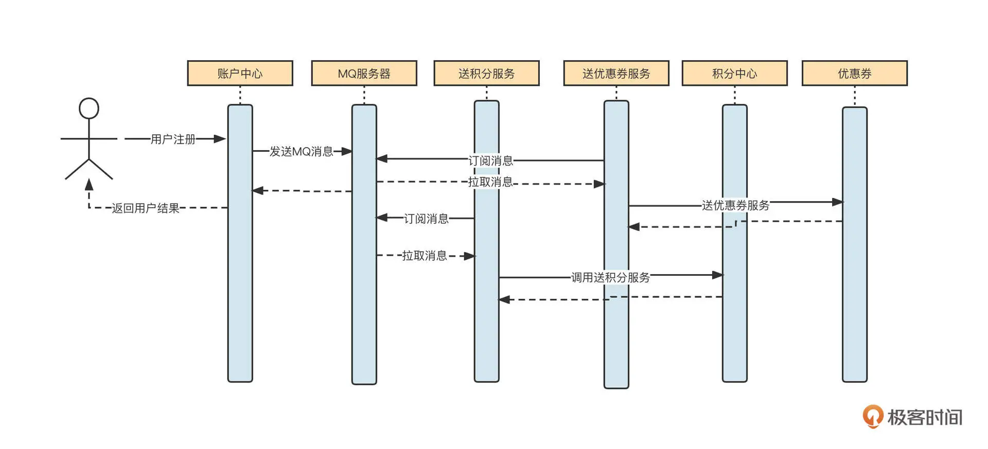 账户中心完成用户注册相关逻辑后,会向 MQ 发送一条消息到 MQ 服务器,然后就直接给用户返回“注册成功”。赠送优惠券、积分等与活动相关的需求我们可以异步执行,这样,无论后续互动逻辑发生什么变化,账户中心都不需要发布新版本。