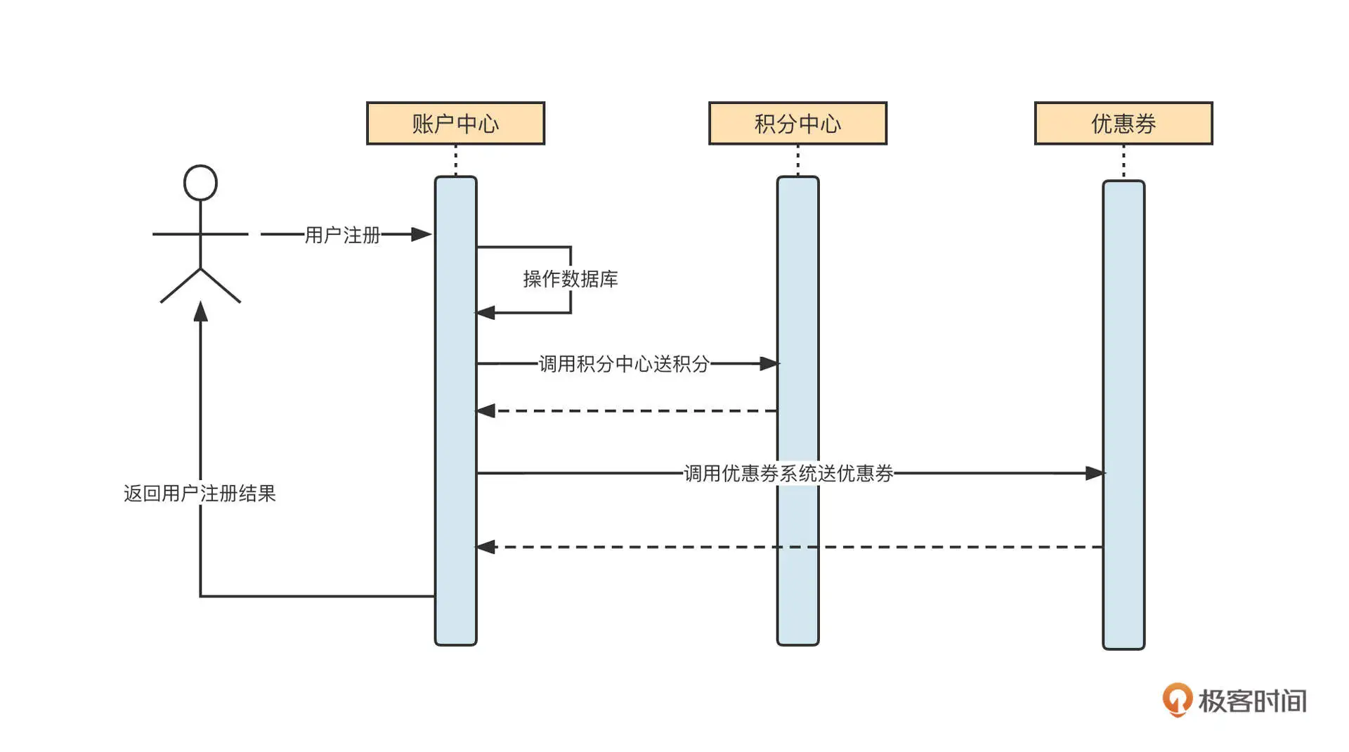 我们首先通过电商平台用户注册送积分、送优惠券这个场景来理解异步解耦合。如果不使用消息中间件,电商平台送积分的实现也许是下图这个样子: