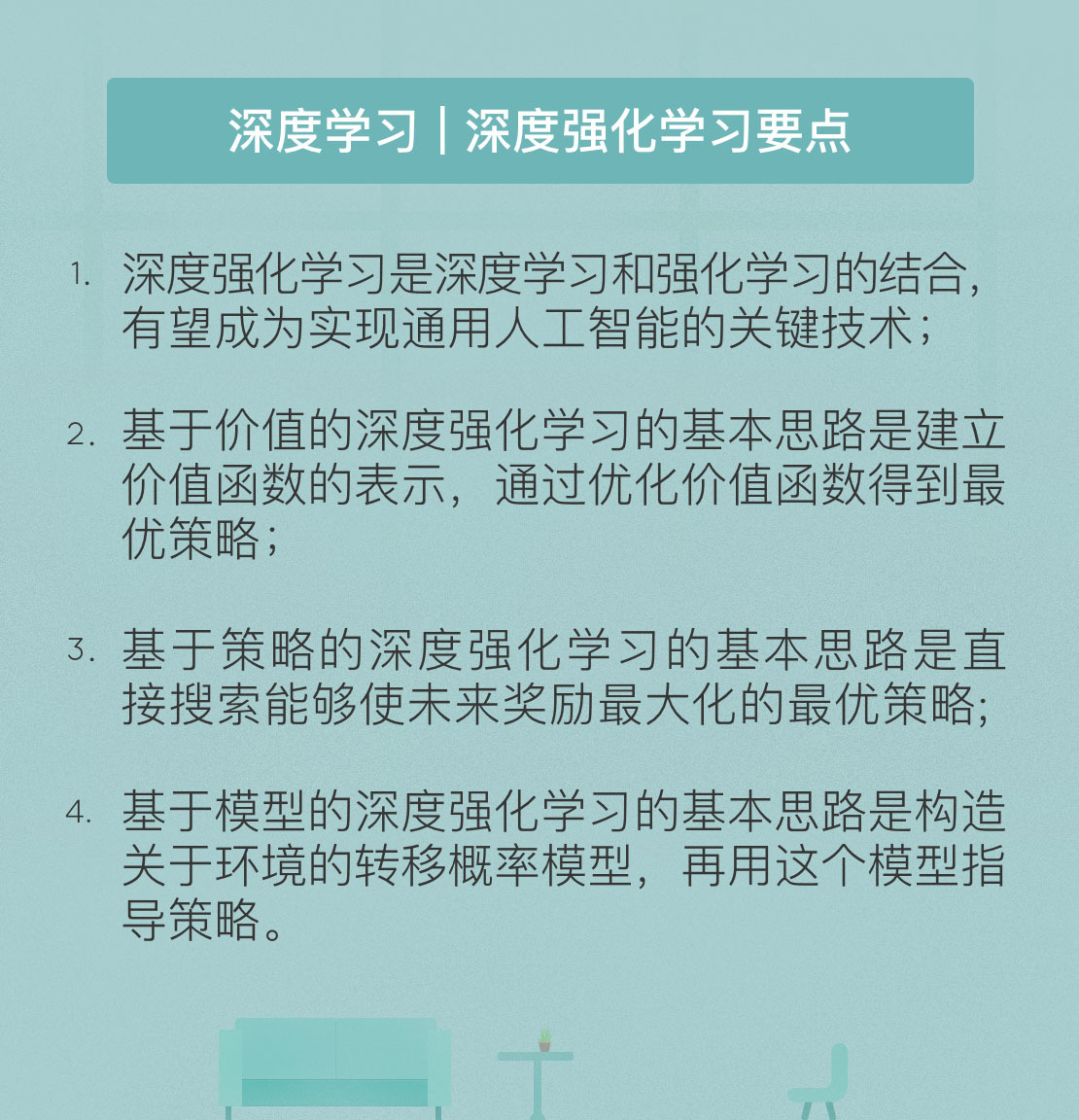 深度强化学习(deep reinforcement learning)是深度学习和强化学习的结合,它将深度学习的感知能力和强化学习的决策能力熔于一炉,用深度学习的运行机制达到强化学习的优化目标,从而向通用人工智能迈进。