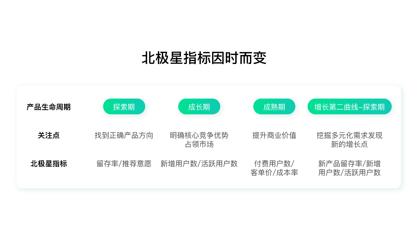 企业长远价值确实不会轻易改变,但在产品的不同生命周期,关注点是不同的,聚焦的指标自然也是不同的