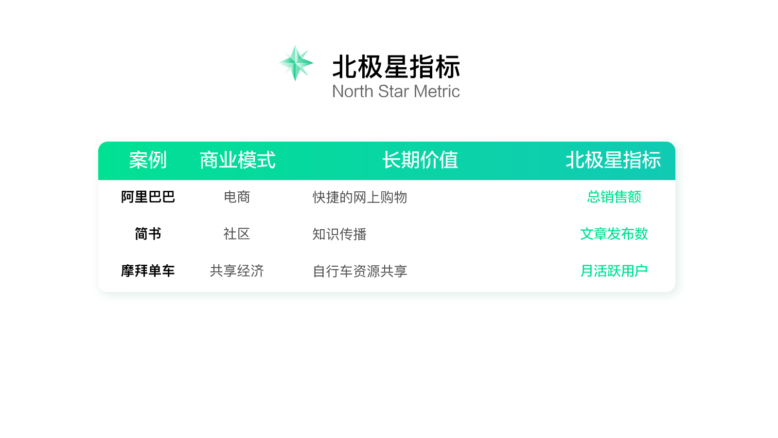 北极星指标的出现很好地解决了上述问题,它关注企业发展的长期价值,促使所有人朝一个方向努力,避免部门内耗、大幅提升效率和价值。