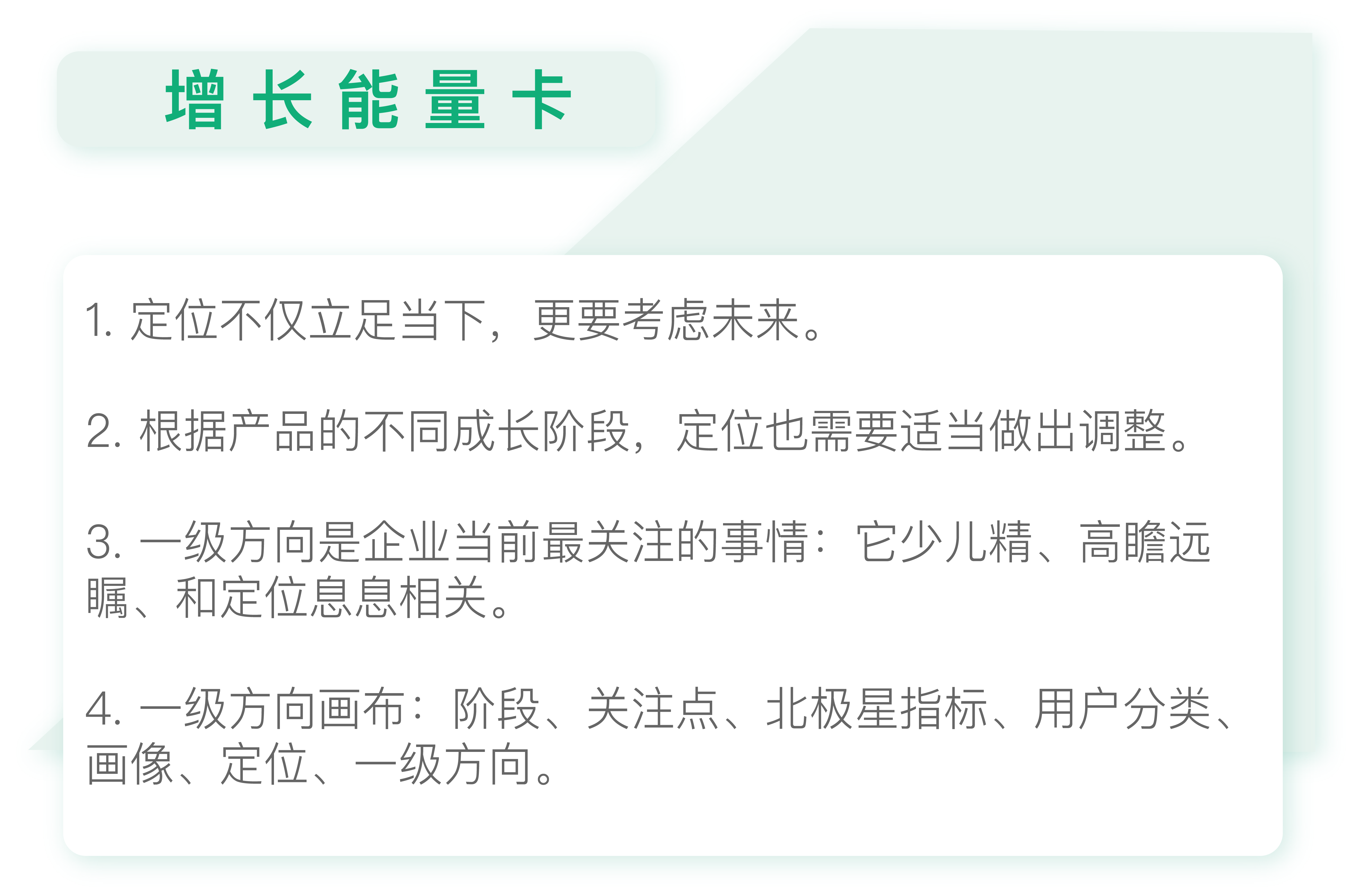 虽然这里的一级方向有多个,但是它们都是围绕定位来的。很多人一说到增长就急着问裂变拉新怎么做,其实它只是增长的一种手段,而且未必适合所有的产品,还是要看具体的定位是怎样的。