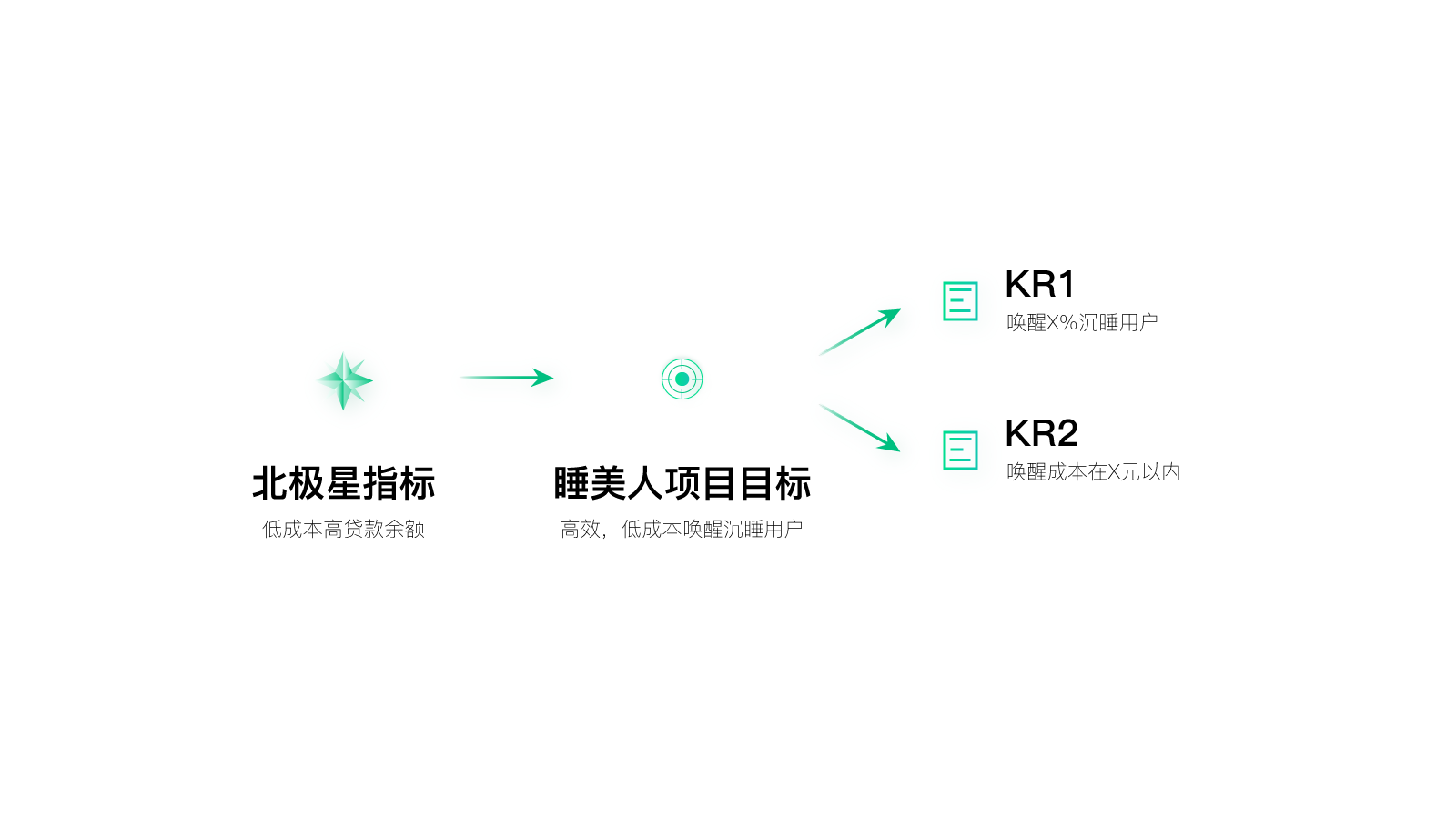 比如,当时的北极星指标是低成本高贷款余额,那么对应“唤醒沉睡用户”这个项目,项目目标自然就是“低成本、高效地唤醒沉睡用户”了。