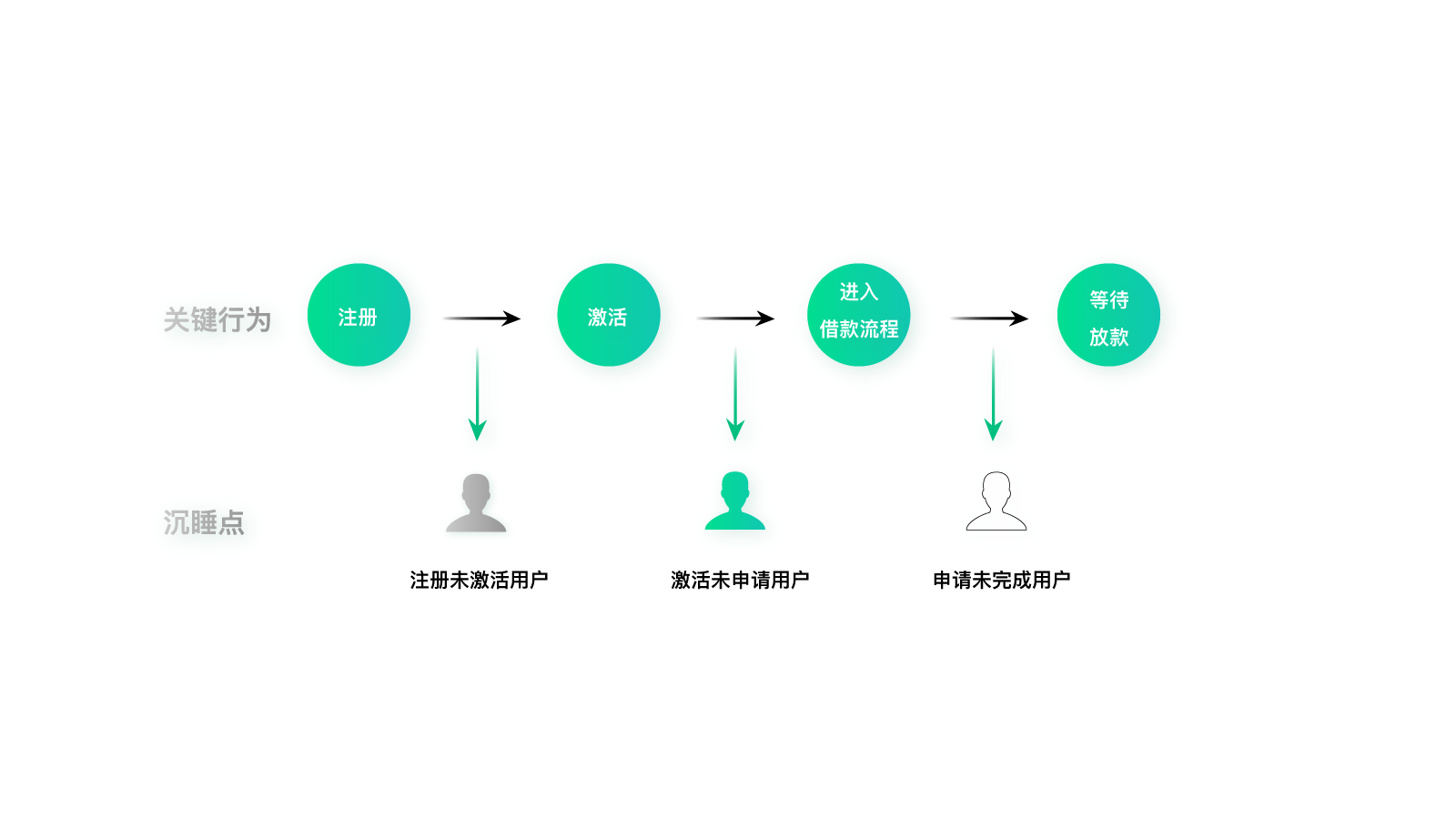 说完资质,我们再来看用户关键行为。还记得我在第19讲中提到过的用户旅程吗?在这里,我们列出用户沉睡的关键旅程,然后找到其中的沉睡点,分别是:注册未激活、激活未申请、申请未完成。
