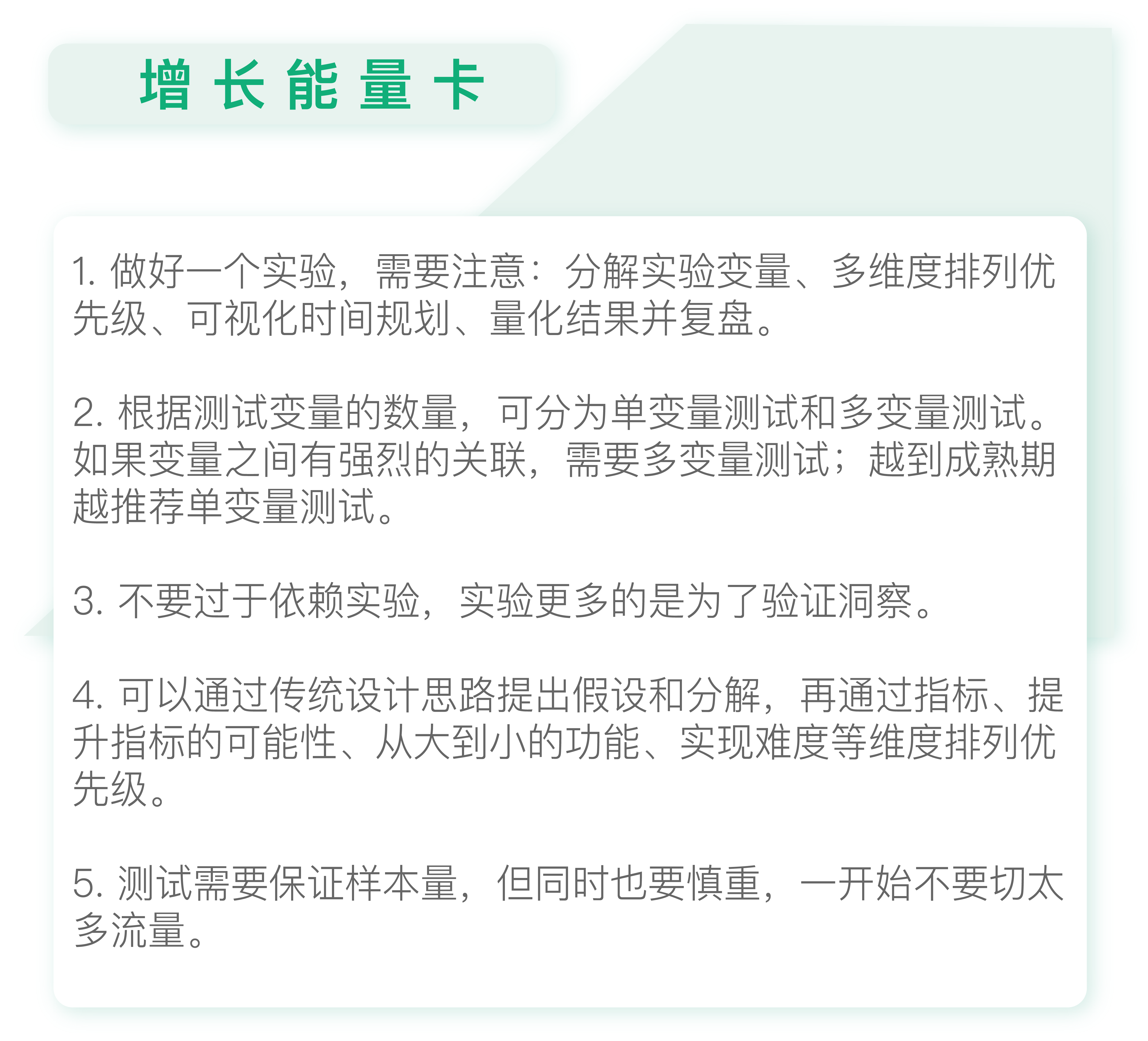 当然这里只是个示例,给你展示如何分解变量做测试。但如果真的是优化界面,我是不建议用这种机械的方式来测试的。很多公司或个人太过推崇实验文化,而越来越不愿意动脑去思考。实际上,实验只能从已知的组合中挑出最好的,却不能帮助我们探索未知。所以,我们还是尽量要用洞察+验证的方式来做增长。