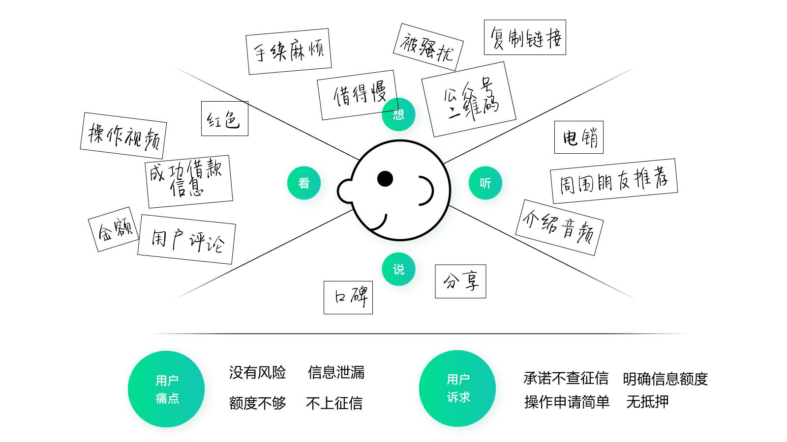 首先,我们进行了一轮头脑风暴,模拟用户看到这个页面的场景(前提是我们之前已经做了深入的用户调研),思考他希望看到什么、他想到了什么、希望听到什么、可能会说些什么……然后提炼出用户痛点和用户诉求。