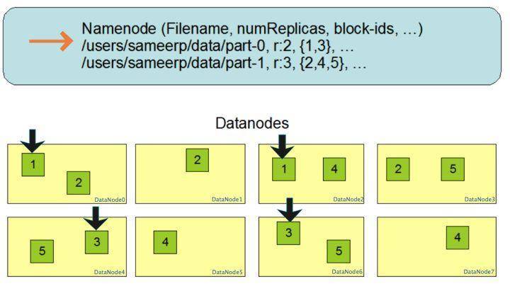 下面这张图是数据块多份复制存储的示意,图中对于文件/users/sameerp/data/part-0,其复制备份数设置为2,存储的BlockID分别为1、3。Block1的两个备份存储在DataNode0和DataNode2两个服务器上,Block3的两个备份存储DataNode4和DataNode6两个服务器上,上述任何一台服务器宕机后,每个数据块都至少还有一个备份存在,不会影响对文件/users/sameerp/data/part-0的访问。