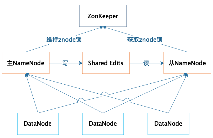 正常运行期间,主从NameNode之间通过一个共享存储系统shared edits来同步文件系统的元数据信息。当主NameNode服务器宕机,从NameNode会通过ZooKeeper升级成为主服务器,并保证HDFS集群的元数据信息,也就是文件分配表信息完整一致。