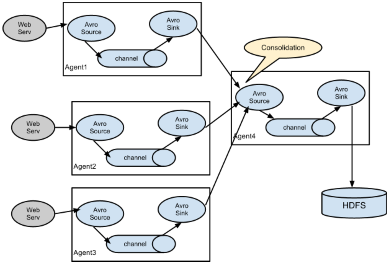 Sink收到数据后,将数据输出保存到大数据存储设备,比如HDFS、HBase等。Sink的输出可以作为Source的输入,这样Agent就可以级联起来,依据具体需求,组成各种处理结构,比如下图的结构。