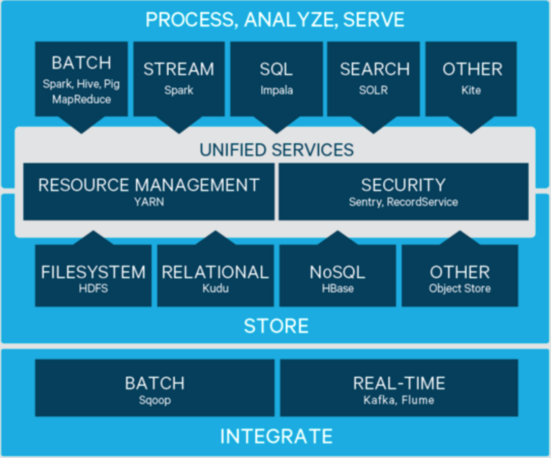 3.统一服务:资源管理用Yarn,安全管理用Sentry和RecordService细粒度地管理不同用户数据的访问权限。