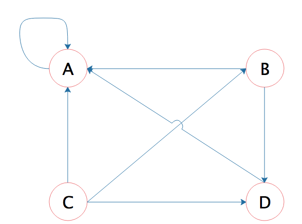 但是这个算法还有个问题,如果某个页面只包含指向自己的超链接,这样的话其他页面不断给它送分,而自己一分不出,随着计算执行次数越多,它的分值也就越高,这显然是不合理的。这种情况就像下图所示的,A页面只包含指向自己的超链接。