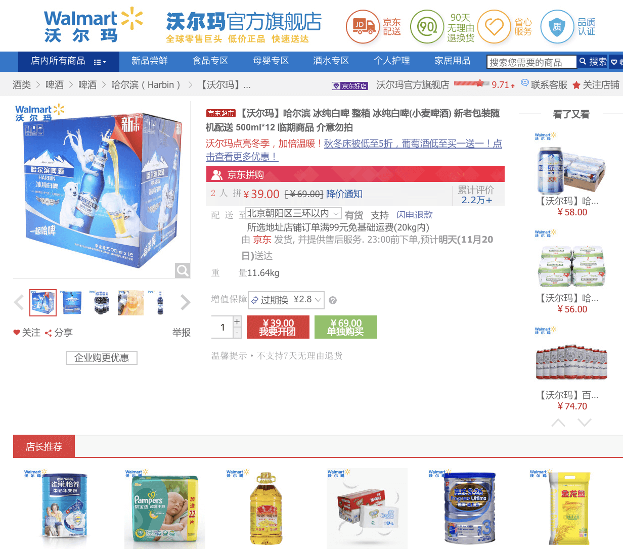我在写专栏文章的时候,访问了京东的沃尔玛官方旗舰店,哈尔滨啤酒下方的六个店长推荐,两个是儿童纸尿裤,还有两个儿童奶粉。