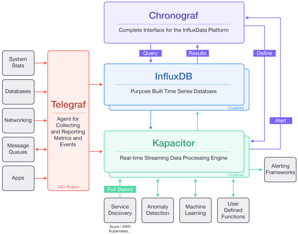 从这张图可以看出,其中Telegraf负责数据收集,InfluxDB负责数据存储,Chronograf负责数据展示,Kapacitor负责数据告警。