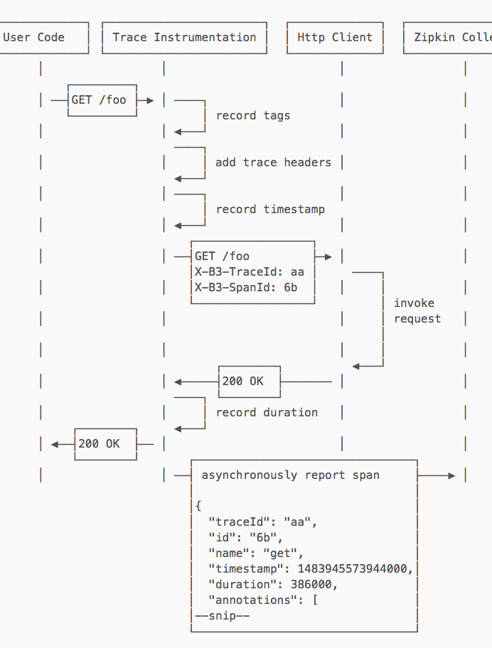 具体流程是,通过在业务的HTTP Client前后引入服务追踪代码,这样在HTTP方法“/foo”调用前,生成trace信息:TraceId:aa、SpanId:6b、annotation:GET /foo,以及当前时刻的timestamp:1483945573944000,然后调用结果返回后,记录下耗时duration,之后再把这些trace信息和duration异步上传给Zipkin Collector。