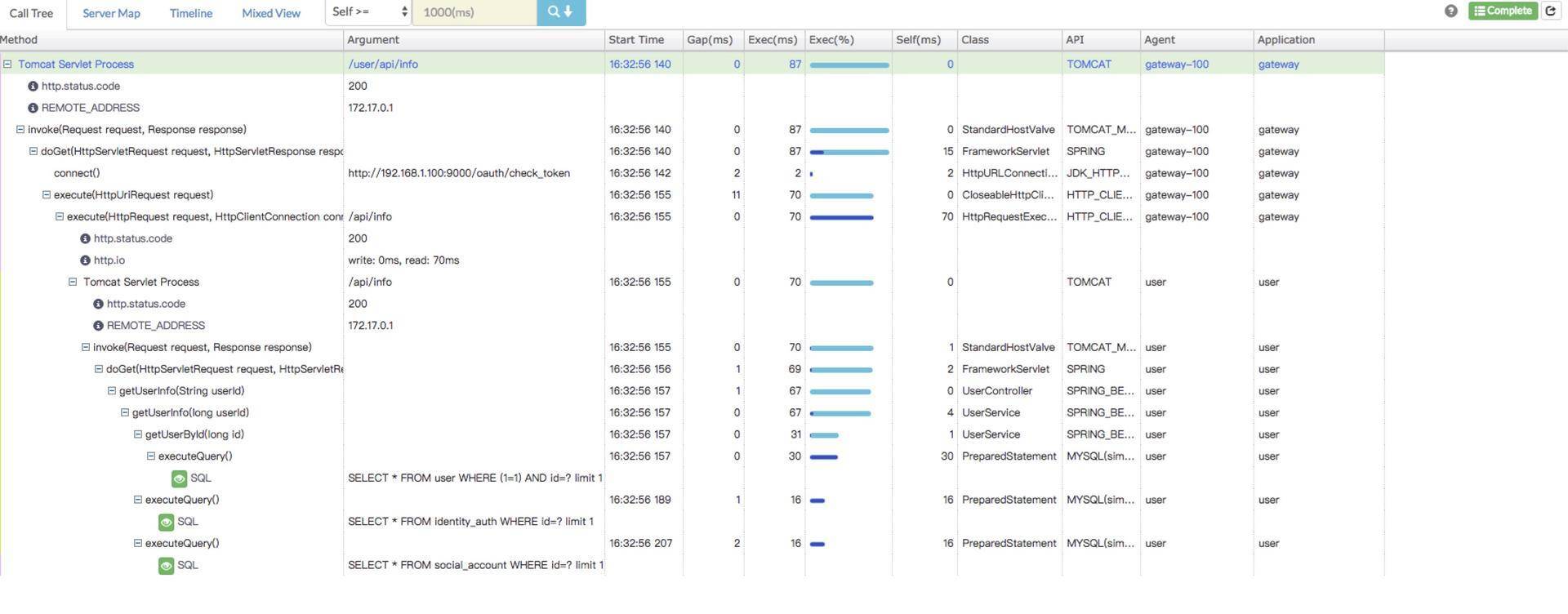 再来看下Pinpoint,因为Pinpoint采用了字节码注入的方式实现trace信息收集,所以它能拿到的信息比OpenZipkin多得多。从下面这张图可以看出,它不仅能够查看接口级别的链路调用信息,还能深入到调用所关联的数据库信息。