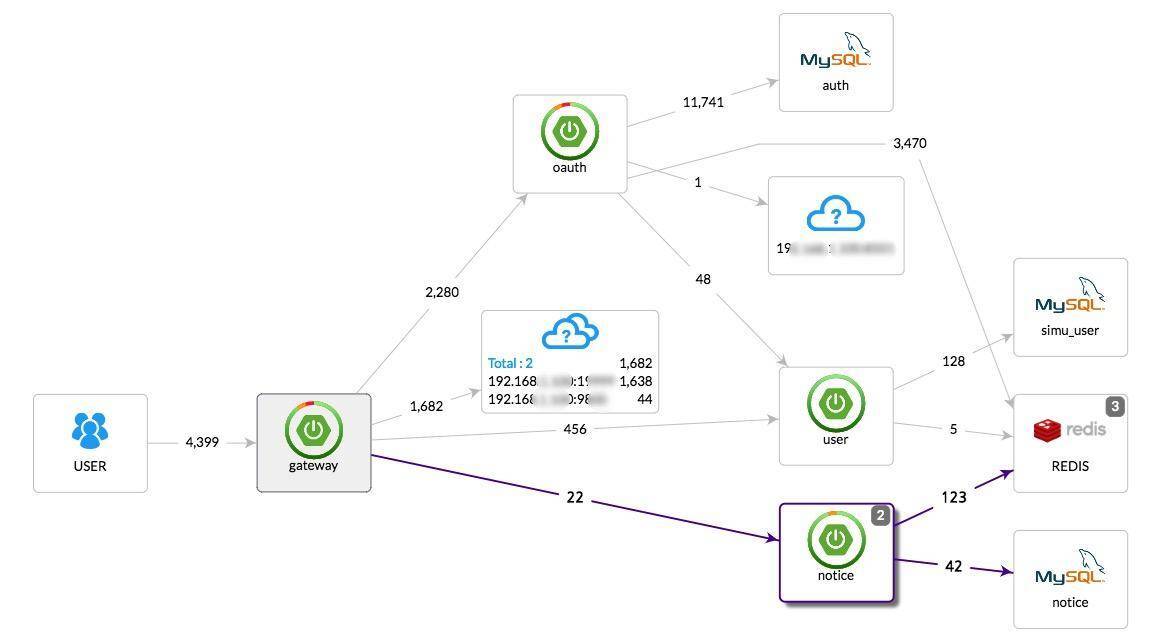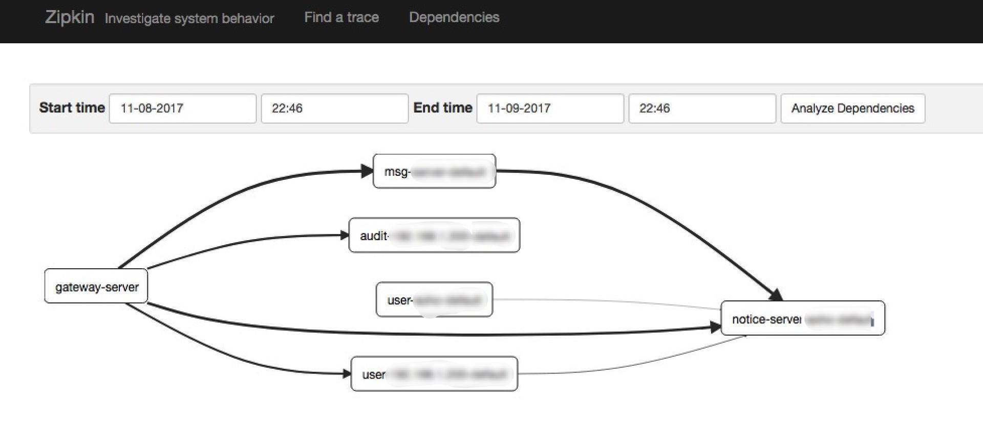 同理在绘制链路拓扑图时,OpenZipkin只能绘制服务与服务之间的调用链路拓扑图,比如下面这张示意图。