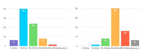 假设我们采用集群压测,不断地缩减线上节点的数量,并观察服务的慢速比指标,当慢速比达到1%时,就停止压测,这个时候就可以计算单机的最大容量了,一般做法是用压测停止时刻的单机平均QPS作为单机的最大容量。但是,采用QPS就真的合理吗?实际上并非如此,这是因为QPS并不能准确衡量单机的消耗,就像下面这两张图所展示的,左图的请求响应时间主要集中在100ms以下,没有超过500ms的;而右图的请求响应时间主要集中在50ms以上,没有低于10ms的。这两种请求分布对单机消耗差异很大,显然右边要对单机的消耗更大一些。在单机QPS都是100的情况下,左边的单机还能继续加大QPS,而右边的单机已经出现超过500ms以上的慢请求了。