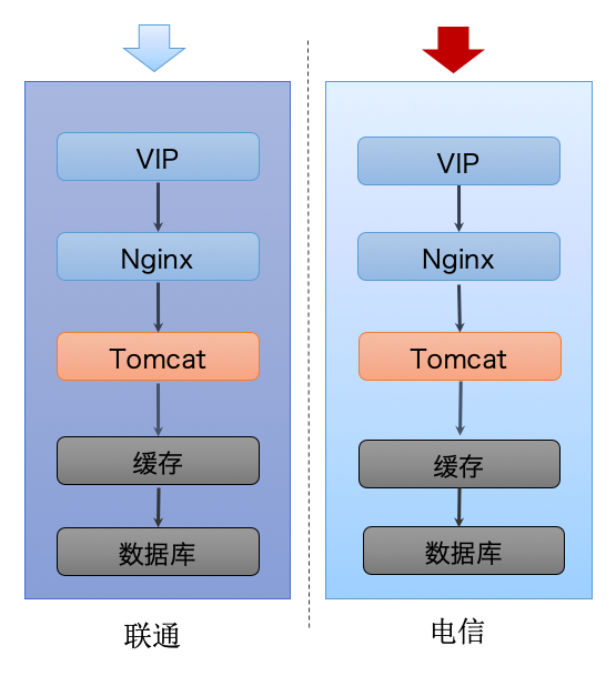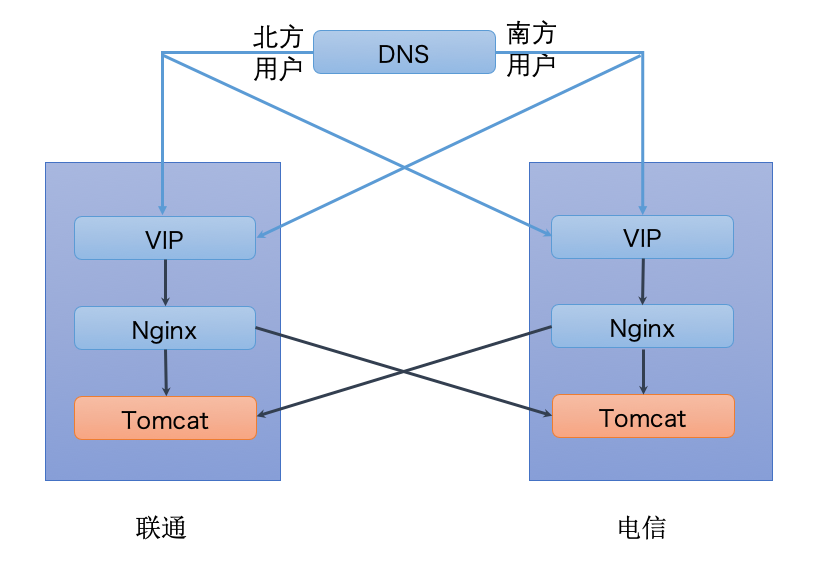 因此在实际部署时,有时候并不能完全遵循就近访问的原则,而是要根据需要调配流量,达到各个机房流量均衡的目的。在实践中可以通过两种方法来切换流量:一种是在DNS解析时,把一部分北方用户的请求解析到电信机房的VIP或者把一部分南方用户的请求解析到联通机房的VIP;另一种是在Nginx转发请求时,把一部分电信机房的Tomcat容器配置到联通机房的Nginx的upstream里或者把一部分联通机房的Tomcat容器配置到电信机房的Nginx的upstream里。这两种方法的示意你可以看下面这张图。