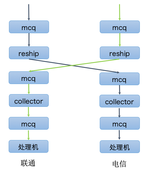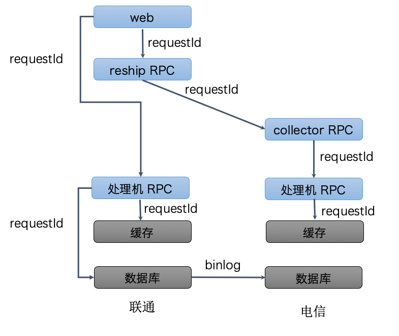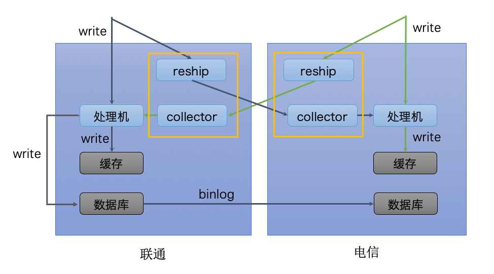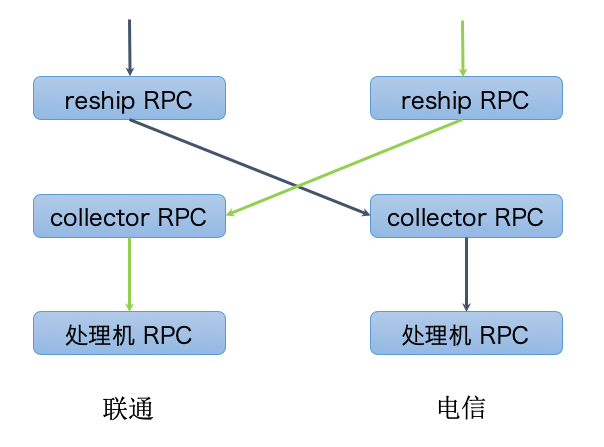 下面这张图是采用RPC调用的实现方案,从图中你可以看到联通机房的写请求会调用联通机房的reship RPC,然后联通机房的reship RPC就会调用电信机房的collector RPC,这样电信机房的collector RPC就会调用电信机房的处理机RPC,从而实现把联通机房的写请求同步给电信机房的处理机进行处理。