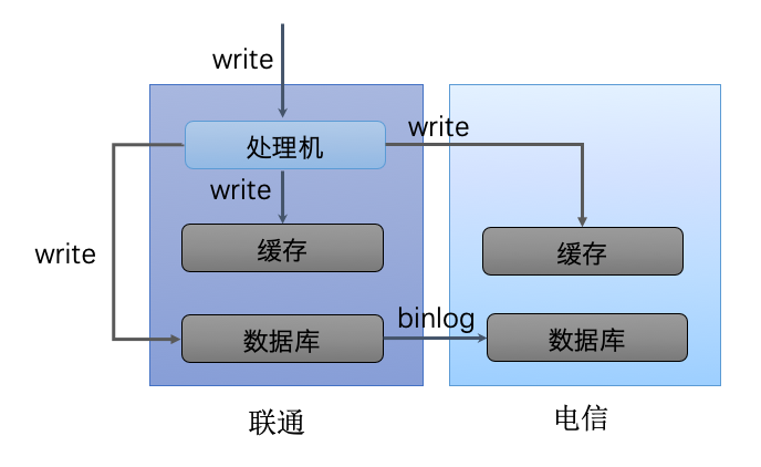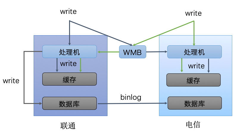 这种架构的数据同步方案如下图所示,联通和电信机房都有写请求,并通过一个叫WMB的消息同步组件把各自机房的写请求同步一份给对方机房,这样的话相当于每个机房都有全量的写请求。每个机房的处理机接收到写请求后更新各自机房的缓存,只有一个机房会更新数据库,其他机房的数据库通过MySQL的binlog同步机制实现数据同步。