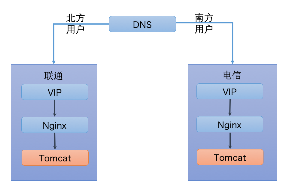 当服务部署在多个机房时,最简单的就是遵循用户就近访问的原则,比如北方用户访问联通机房,南方用户访问电信机房。微博的服务也是同时部署在联通和电信机房,你可以看下面这张图,访问时根据用户访问的IP,通过DNS解析到不同的机房,如果是北方用户就访问联通机房,南方用户就访问电信机房。并且为了实现负载均衡,还会在每个机房分别部署四层负载均衡器VIP以及七层负载均衡器Nginx。比如来自北方用户的请求通过DNS解析到联通机房下任意一个VIP,然后通过VIP把请求转发给联通机房下任意一个Nginx,Nginx再把请求转发给联通机房下任意一个Tomcat容器,通过这种方式来实现各个机房内高并发访问下的负载均衡。