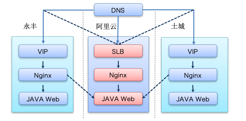 这两种方案应对的业务场景不同,DNS层的切换主要是针对大规模流量增长的情况,这个时候一般四层VIP、七层Nginx和Java Web的容量都不足以应对,就需要在DNS层就把流量切到阿里云机房,在阿里云扩容SLB、Nginx和Java Web;而Nginx层的切换主要是针对私有云内某个机房的Java Web容量不足或者服务有问题的时候,需要把这个机房的一部分流量切换到其他机房,这个时候就可以只扩容阿里云机房的Java Web,然后从Nginx层把流量切换到阿里云机房。