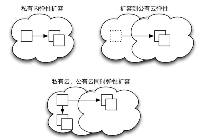 私有云和公有云同时弹性扩容:当某个服务池的容量不足需要进行扩容时,如果该服务池所在的集群内的主机数量不足时,就需要在同时在私有云和公有云上进行弹性扩容,最后都加入到服务池中去。