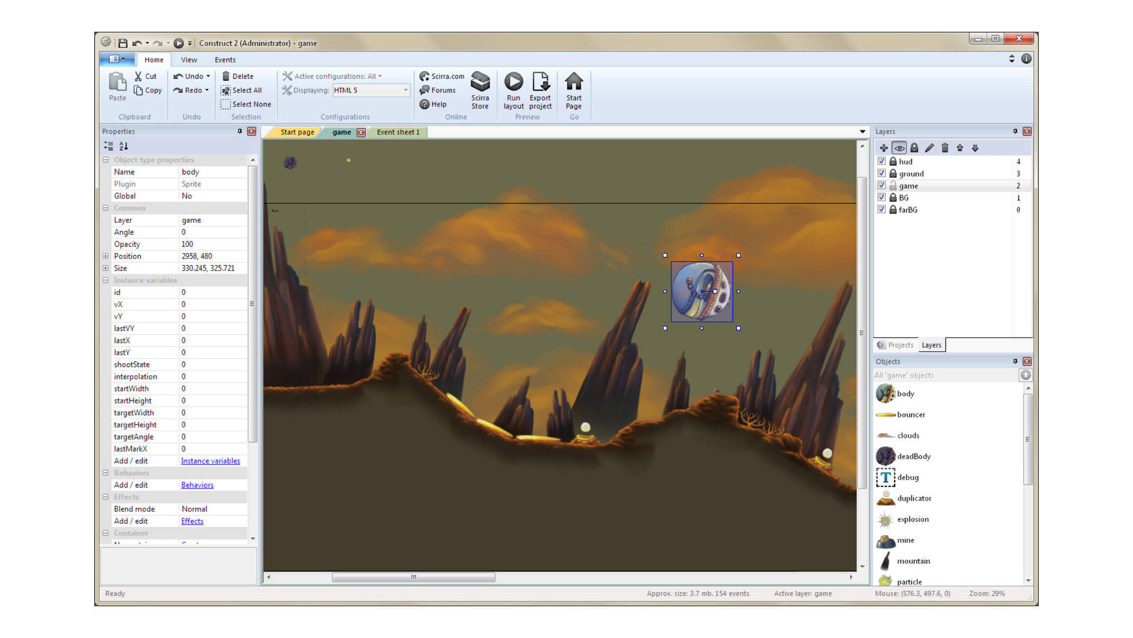 • 可以设计任何类型的2D游戏,而且不需要编程的技能(可以由事件系统控制);