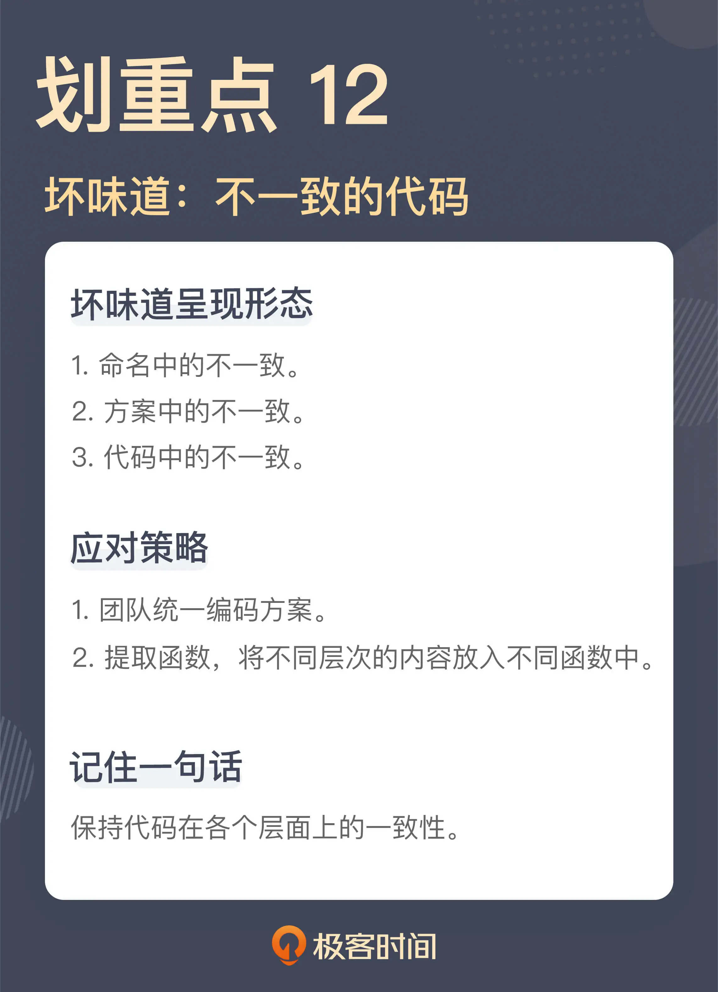 代码中的不一致常常是把不同层次的代码写在了一起,最典型的就是把业务层面的代码和实现细节的代码混在一起。解决这种问题的方式,就是通过提取方法,把不同层次的代码放到不同的函数里,而这一切的前提还是是分离关注点,这个代码问题的背后还是设计问题。