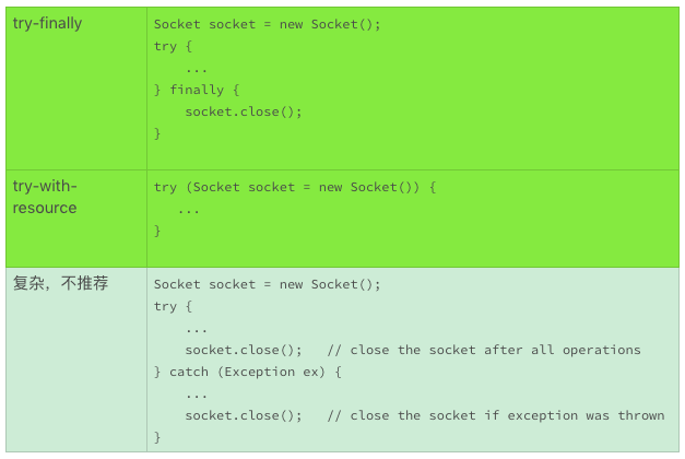 需要注意的是,close()操作,一定要使用try-finally或者try-with-resource语句。要不然,关闭资源的代码可能很复杂。