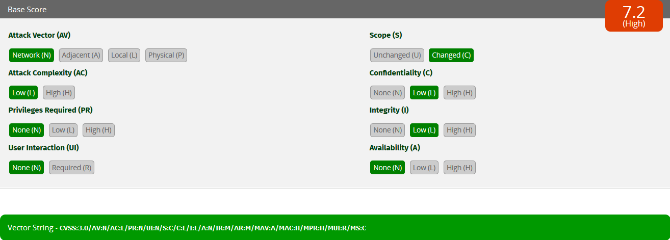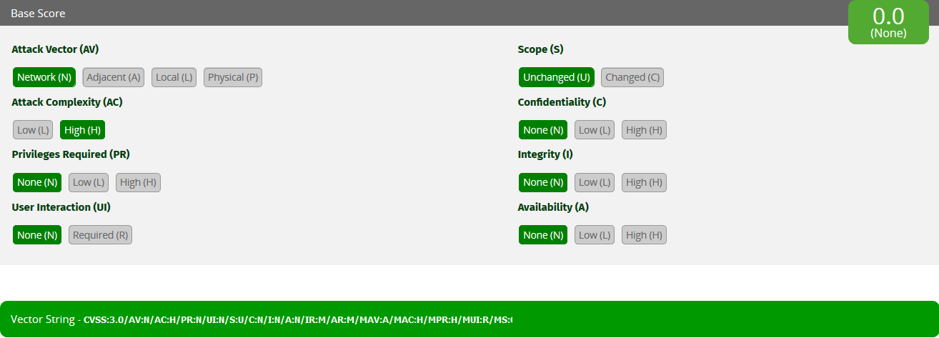 比如,本文评审案例的那个缺陷,并不是一个安全问题。 如果我非要使用通用缺陷评分系统来描述它,这个计分应该是0.0分,直观描述看起来如下图: