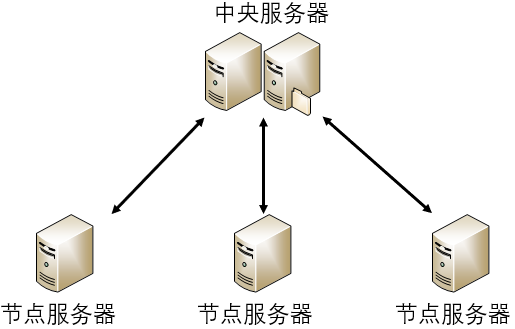 集中式结构最大的特点,就是部署结构简单。这是因为,集中式系统的中央服务器往往是多个具有较强计算能力和存储能力的计算机,为此中央服务器进行统一管理和调度任务时,无需考虑对任务的多节点部署,而节点服务器之间无需通信和协作,只要与中央服务器通信协作即可,具体示意图如下所示: