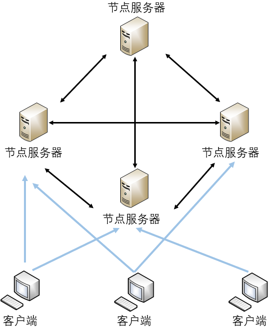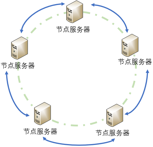 也就是说,在非集中式结构中,没有中央服务器和节点服务器之分,所有的服务器地位都是平等(对等)的,也就是我们常说的“众生平等”。这样一来,相比于集中式结构,非集中式结构就降低了某一个或者某一簇计算机集群的压力,在解决了单点瓶颈和单点故障问题的同时,还提升了系统的并发度,比较适合大规模集群的管理。
