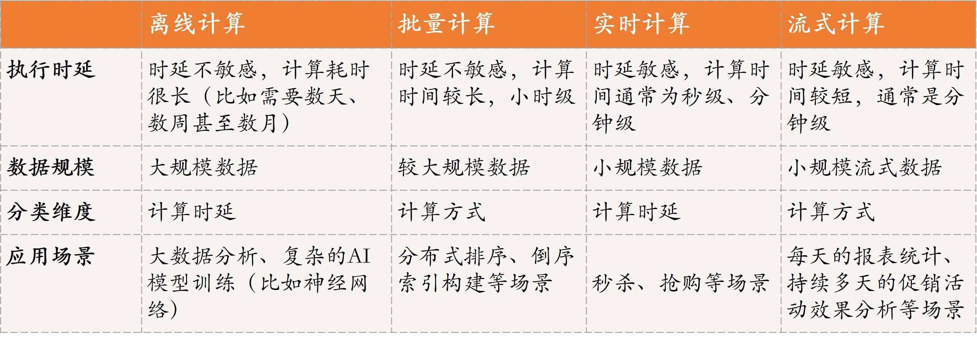 接下来,我们再看一下实时计算。实时计算其实是和离线计算相对应的,离线计算对时延要求不敏感,相反,实时计算对时延的要求比较敏感。这种模式需要短时间执行完成并输出结果,比如秒级、分钟级,也就是说强调时效,通常用于秒杀、抢购等场景。实时计算由于时延要求低,因此计算量通常不大、数据量也不会太多,所计算的数据往往是K、M级别的。