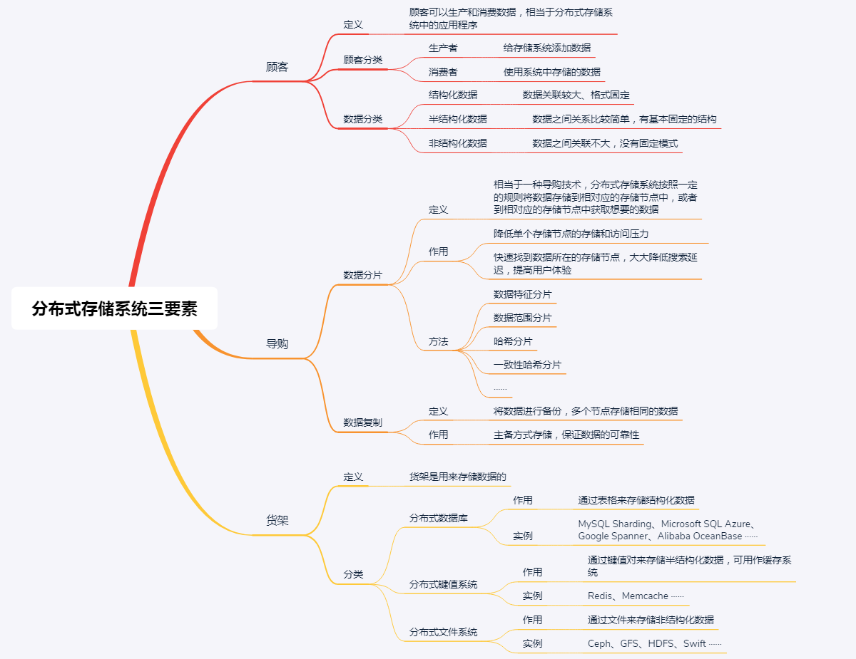 不同应用场景中,顾客产生的数据类型、格式等通常都不一样。根据数据的特征,这些不同的数据可以被划分为三类:结构化数据、半结构化数据和非结构化数据。与之相对应的,货架也就是数据存储系统,也包括三类:分布式数据库、分布式键值系统和分布式文件系统。