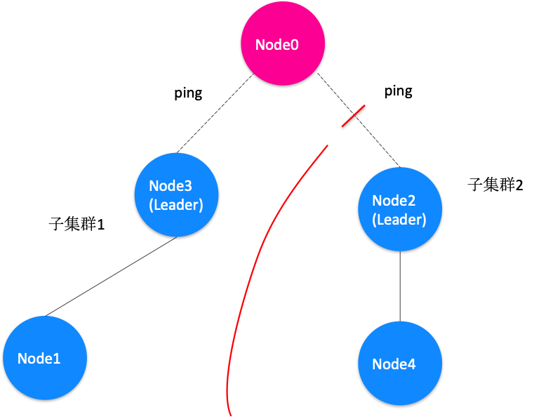 如下图所示,假设引入Node0作为第三个节点,该节点IP为10.12.24.35,当出现网络分区子集群1{Node1, Node3}和子集群2{Node2, Node4}时,每个子集群中选择一个Leader节点并ping一下Node0的IP,能ping通则保留,否则舍弃。比如下图中,子集群1可以ping通,子集群2 ping不通,因此保留子集群1。